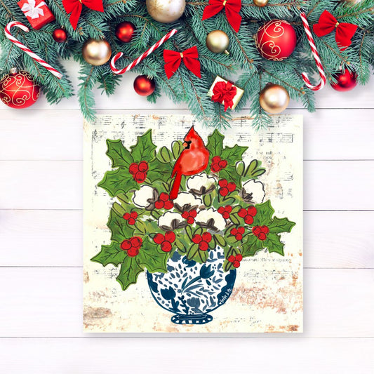 Blue Willow Cotton Holly Berry Cardinal Wrapped Canvas