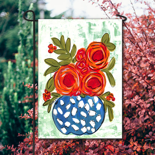 Red Floral in Blue & White Vase Garden Flag